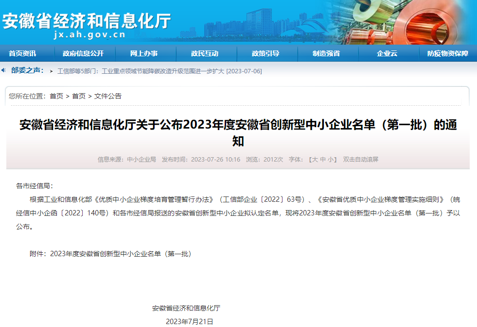 根據工業和信息化部《優質中小企業梯度培育管理暫行辦法》(工信部企業〔2022〕63號)、《安徽省優質中小企業梯度管理實施細則》(皖經信中小企函〔2022〕140號)和各市經信局報送的安徽省創新型中小企業擬認定名單,合肥原位科技有限公司被認定為2023年度安徽省創新型中小企業。